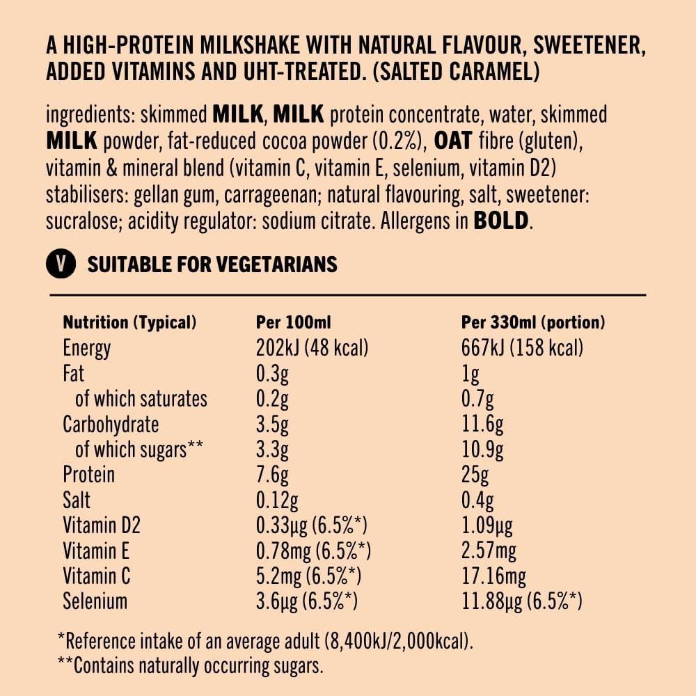 IngredientsSkimmed MILK, MILKProtein Concentrate, Water, Skimmed MILK Powder, Fat-Reduced Cocoa Powder (0.2%), OAT Fibre (Gluten), Vitamin & Mineral Blend (Vitamin C, Vitamin E, Selenium, Vitamin D2), Stabilisers: Gellan Gum, Carrageenan; Flavourings, Salt, Sweetener: Sucralose; Acidity Regulator: Sodium Citrate.