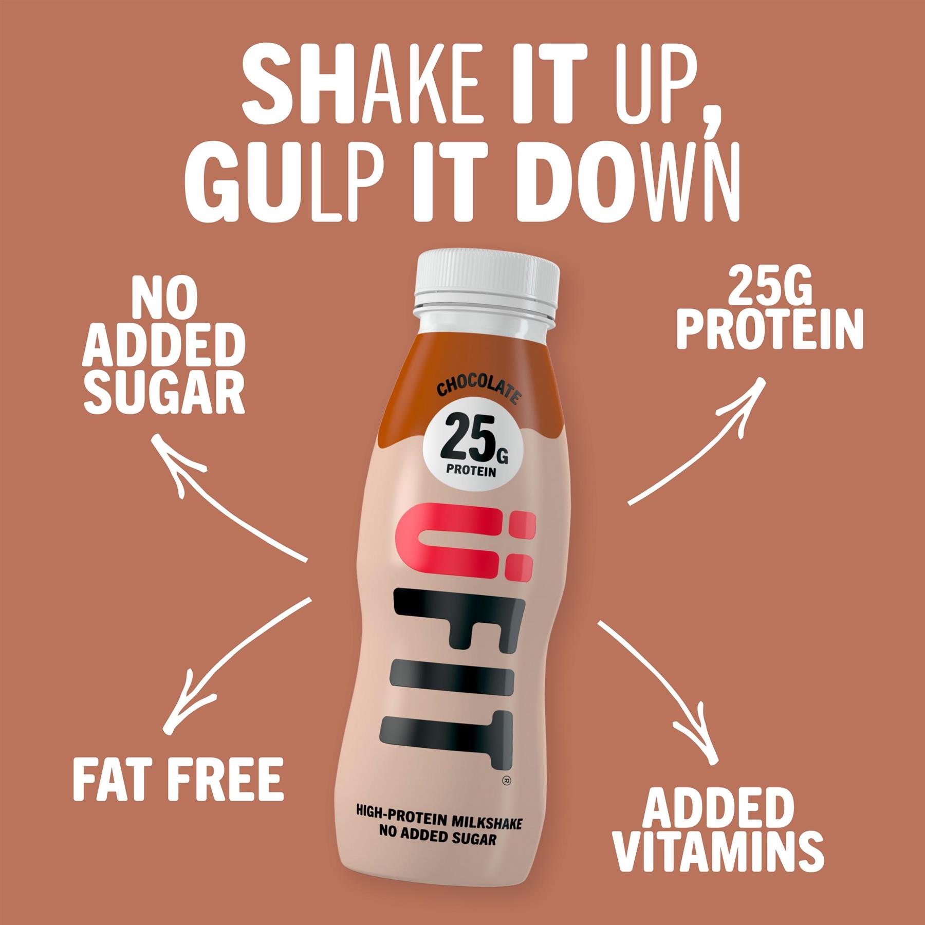 Fuel your day with UFIT Protein Milkshake in rich chocolate flavor, delivering 25g of high-quality protein in every 330ml bottle. This convenient pack of 10 is perfect for busy lifestyles, post-workout recovery, or a satisfying on-the-go snack. Smooth, creamy, and delicious, it provides a balanced boost to support muscle maintenance and keep you feeling fuller for longer. Low in fat and with no added sugar, it’s a smart choice for those looking to stay fit without compromising on taste. Enjoy a refreshing, ready-to-drink shake that combines nutrition, convenience, and indulgent chocolate flavor in every sip.