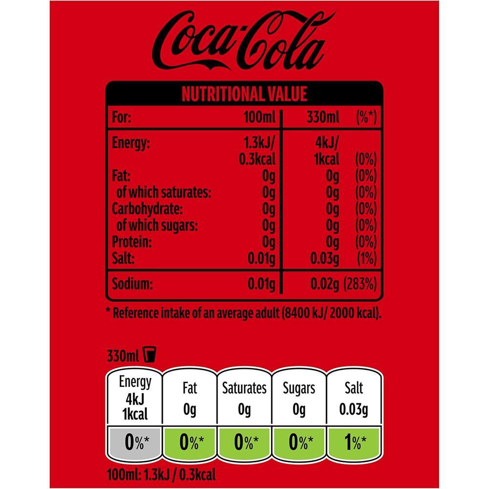 Enjoy the crisp, refreshing taste of Coca Cola with zero sugar. This pack contains 24 x 330ml cans, making it ideal for sharing, stocking up at home, or keeping chilled for any occasion. Coca-Cola Zero Sugar offers the same great taste as the original, without the sugar, a perfect balance of fizz and flavour for those seeking a lighter option. Crafted for enjoyment without compromise, each can delivers the bold, iconic Coca-Cola flavour you love, with no added sugar. Whether you’re entertaining guests, packing lunchboxes, or simply craving a cold, fizzy treat, this multipack ensures you always have your favourite drink on hand.