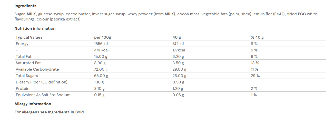 IngredientsSugar, MILK, glucose syrup, cocoa butter, invert sugar syrup, whey powder (from MILK), cocoa mass, vegetable fats (palm, shea), emulsifier (E442), dried EGG white, flavourings, colour (paprika extract)