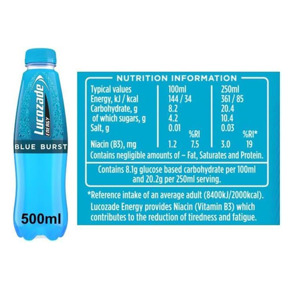 - Energetic Boost: Lucozade Blue Burst Energy Drink is expertly formulated to deliver a rapid and effective energy boost, making it an ideal choice for combating fatigue and boosting vitality.