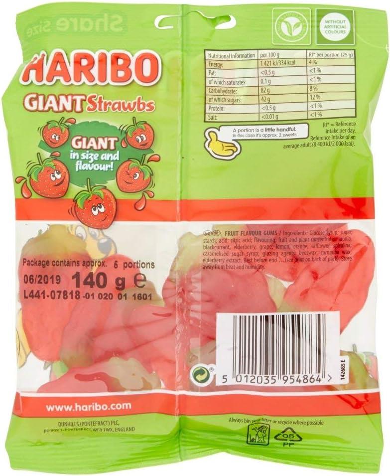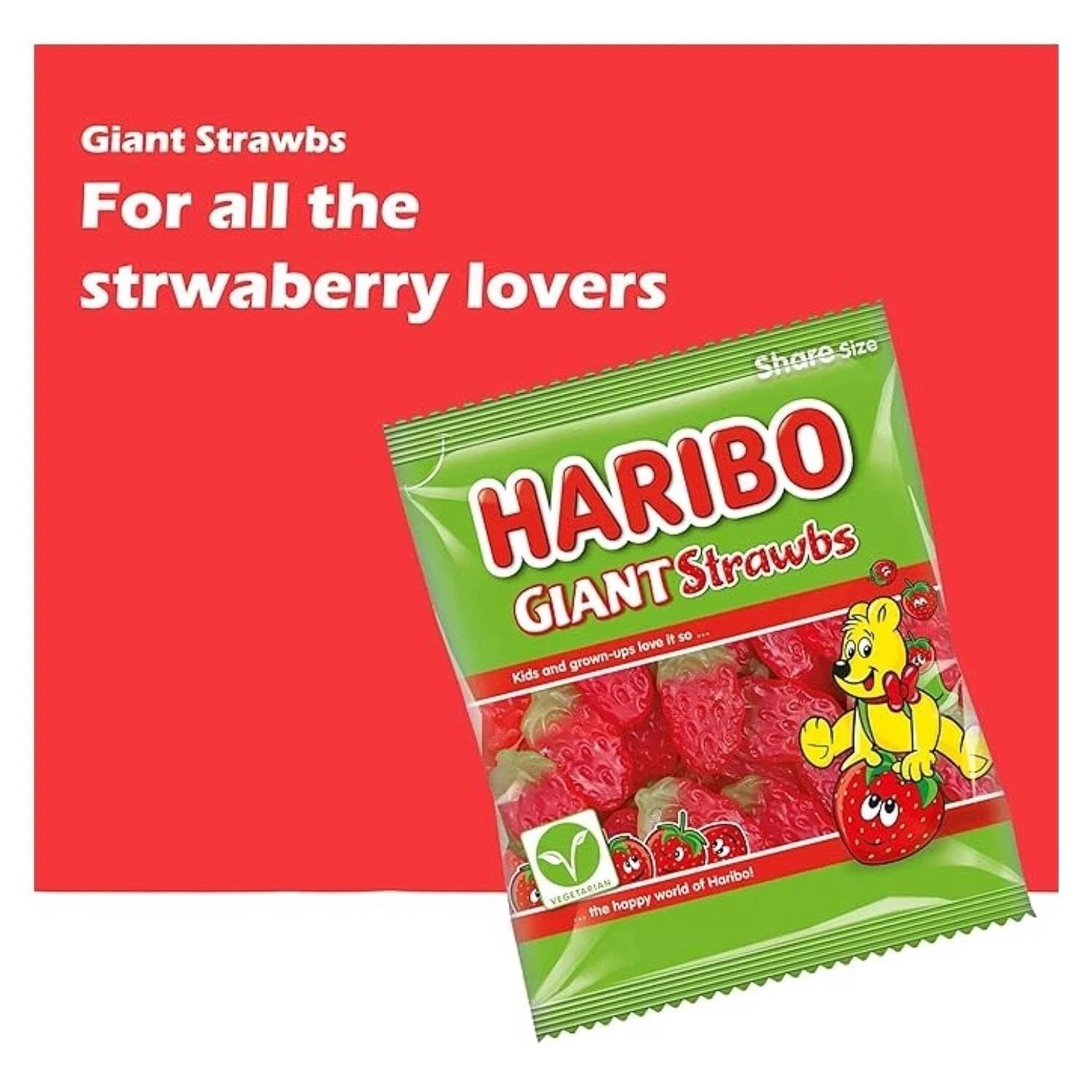 Haribo Giant Strawbs Sweets 12 x 140g Bags Strawberry Flavour Chewy Jelly Candy Share Size Pack For