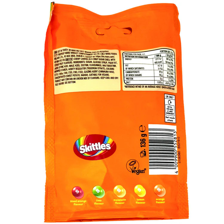 Features:- Vibrant Citrus Flavours: Each bag offers a zesty mix of five citrus-inspired flavours—Orange, Lemon, Lime, Blood Orange, and Mandarin—providing a tangy twist on the classic Skittles experience.