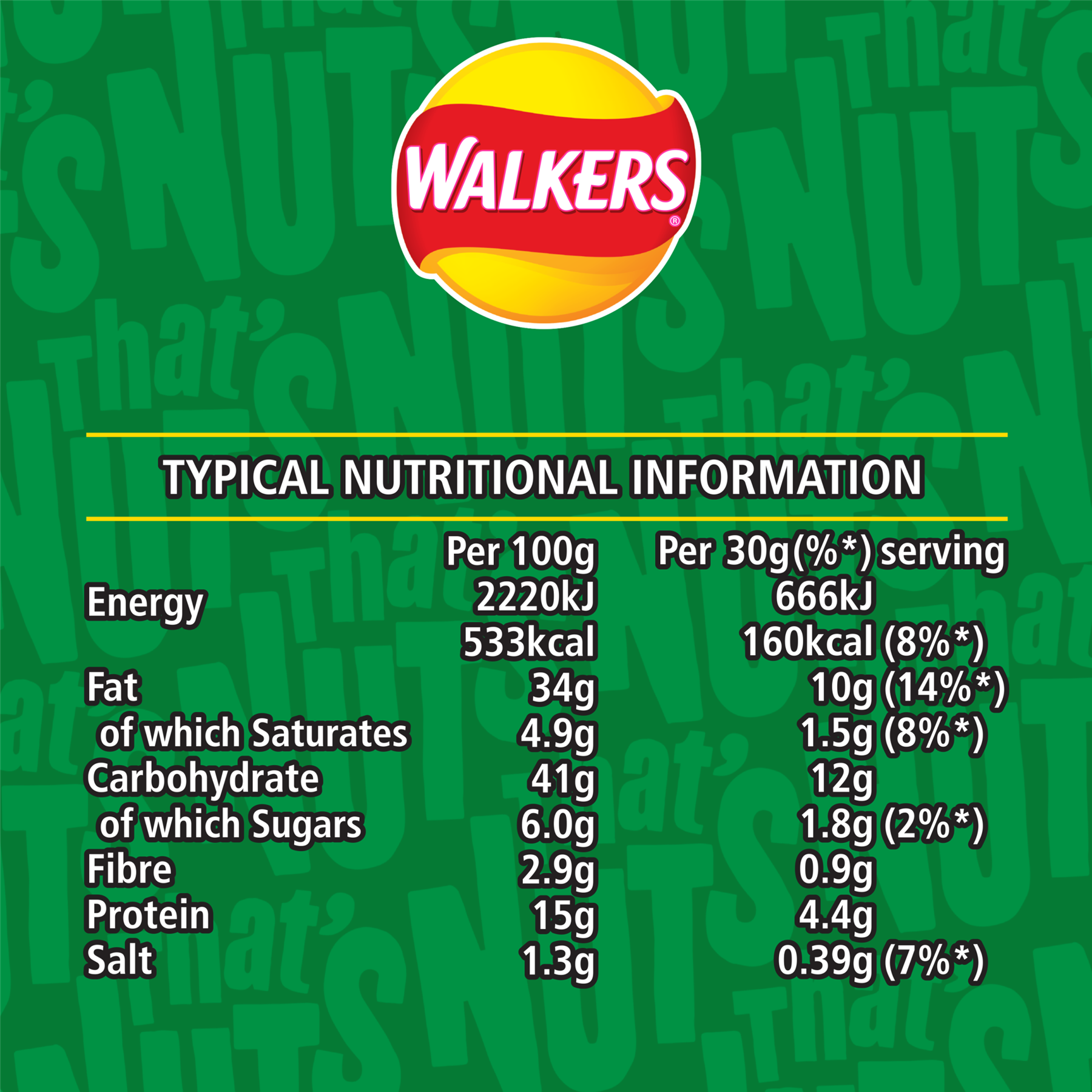 Walkers That's Nuts Salt & Vinegar 8 x 160g Packs bring you premium quality peanuts wrapped in a golden crunchy shell and seasoned with the classic Walkers salt & vinegar flavour. Perfect for parties, snacks, and everyday enjoyment, each bag serves 5–6 people. Made in the UK and suitable for vegetarians.