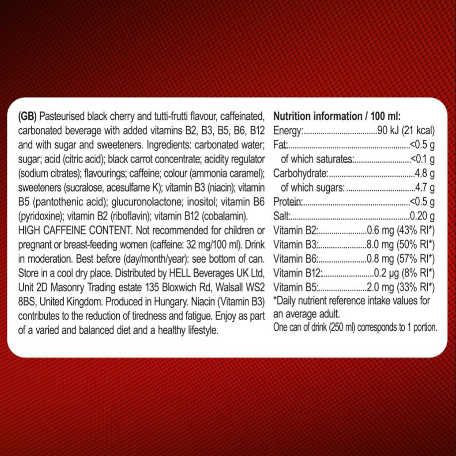 Features:- 24 x 250ml cans of Hell Energy Drink Black Cherry flavour