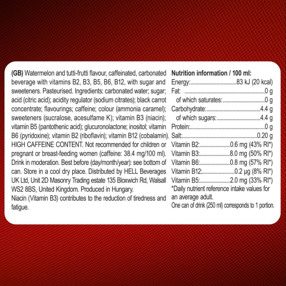 Features:- 24 x 250ml cans of Hell Energy Drink Watermelon Flavour