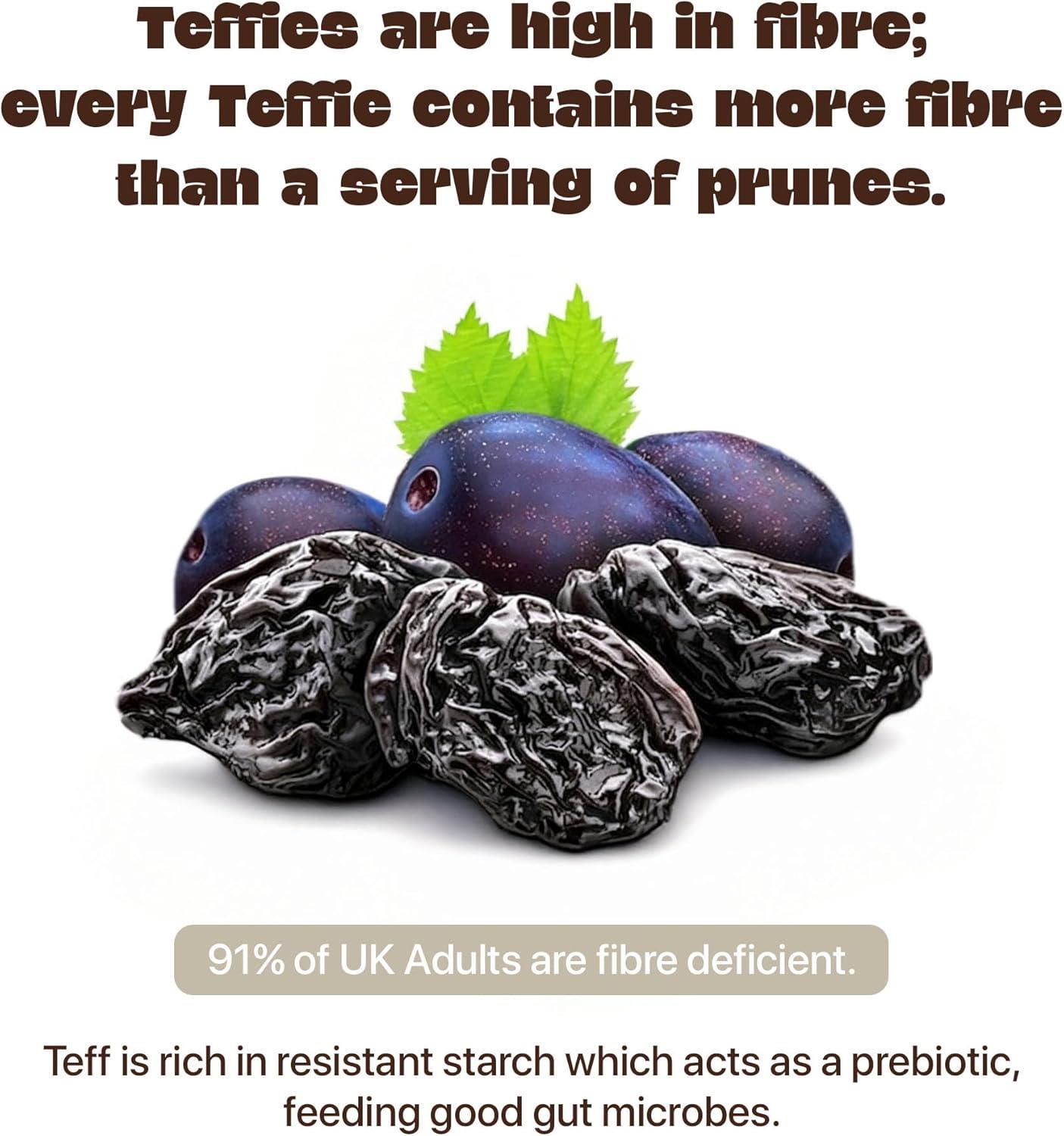 A wholesome, on-the-go snack made from teff flour, dates, and dark chocolate, with no artificial sweeteners/colourings/flavourings. Teffie is a nutritious, health-conscious snack made from teff, a naturally gluten- free ancient grain known for its high nutritional value. The product is free from the 14 major allergens, making it suitable for a wide range of dietary requirements, including gluten-free, vegan, and allergen-free diets.
