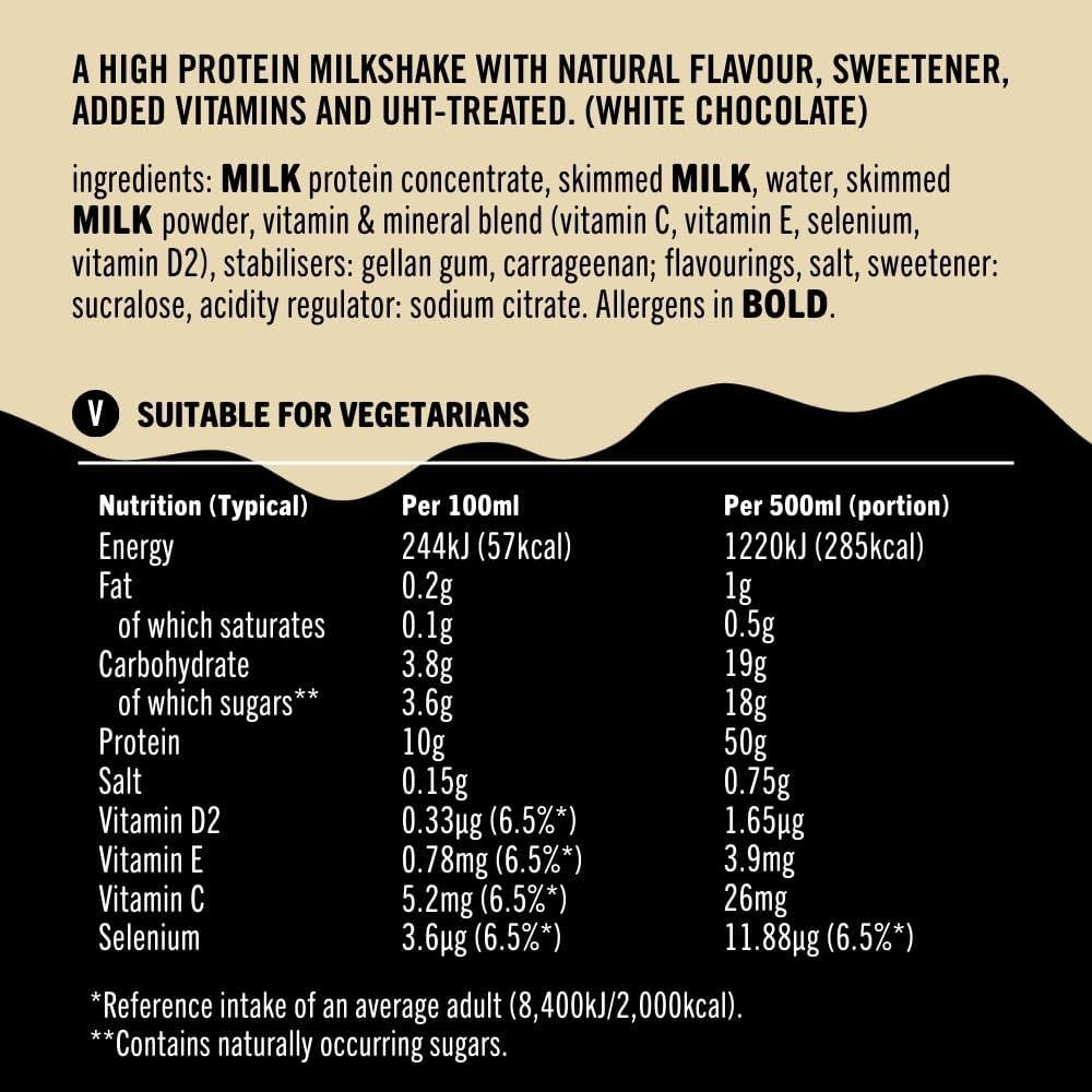 Power up your nutrition with UFIT White Chocolate Protein Milkshake, delivering an impressive 50g of high-quality protein in every 500ml bottle. This pack of 8 is ideal for intense workouts, muscle recovery, or those needing a higher daily protein intake. With a rich, creamy white chocolate flavor, it offers a smooth and satisfying drinking experience without compromising on taste. Low in fat and with no added sugar, it’s a smart choice for performance-focused individuals. Convenient and ready to drink, this high-protein shake helps support muscle growth while keeping you energized and fuller for longer throughout the day.
