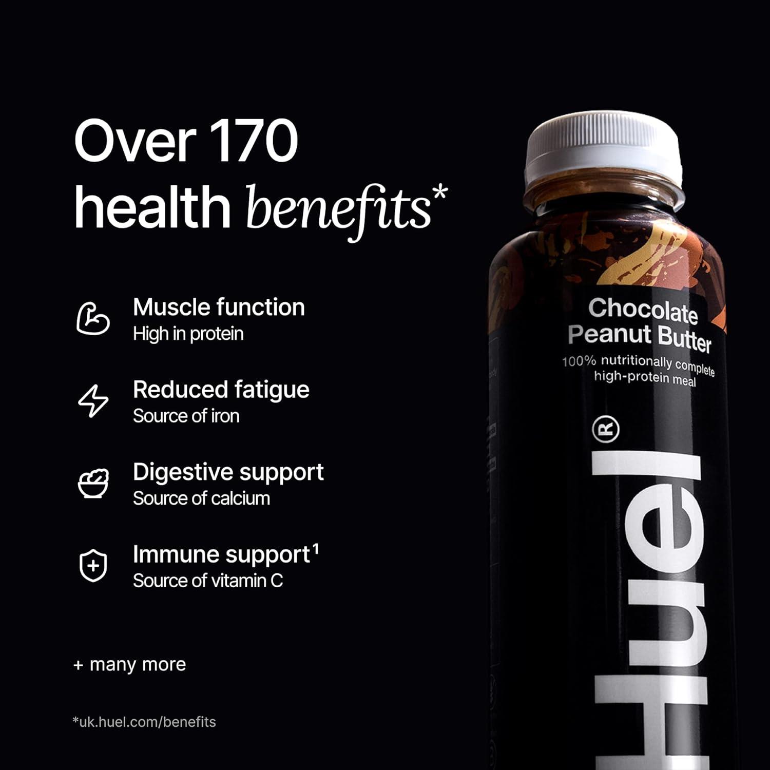 Huel Black Edition Chocolate Peanut Butter ready-to-drink (8 × 500ml bottles) is a convenient, nutritionally complete meal designed for busy lifestyles. Each bottle delivers around 400 calories, 35g of plant-based protein, and a balanced mix of carbohydrates, healthy fats, fibre, and 26 essential vitamins and minerals. With its smooth, creamy texture and deep chocolate taste, this shake feels like a treat while delivering everything your body needs. It’s ideal for replacing a meal without compromising on flavour or nutrition.