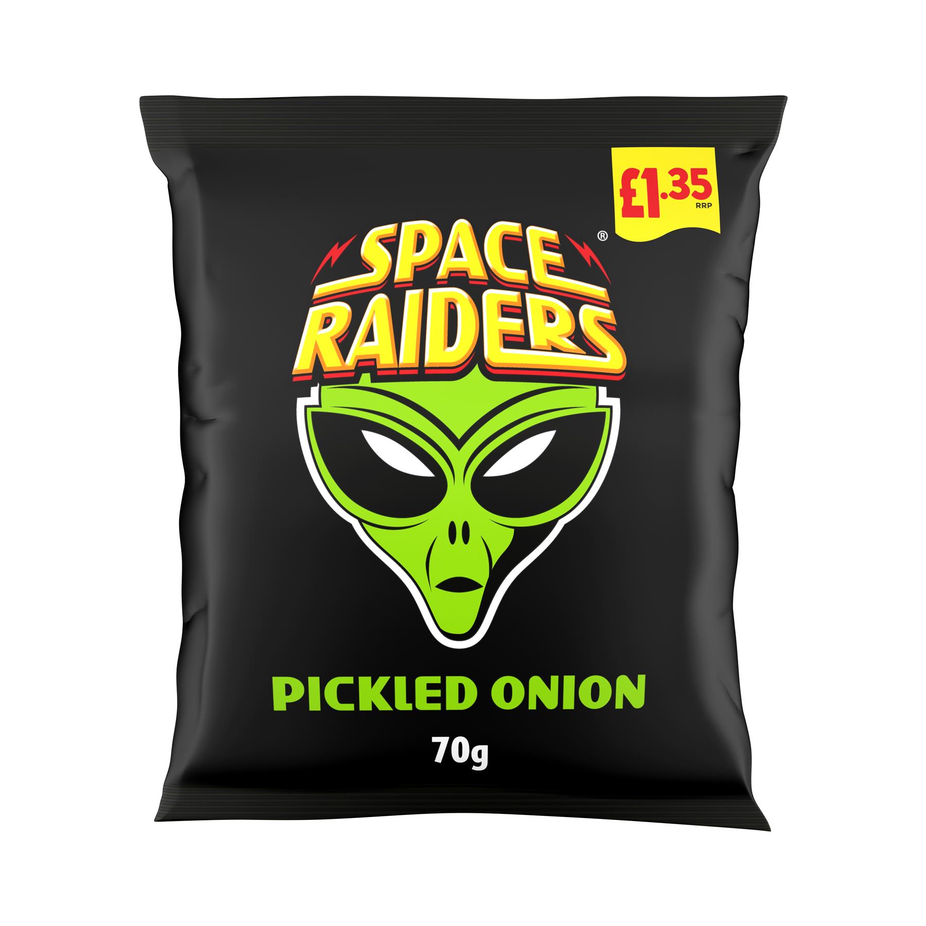 Space Raiders Pickled Onion Crisps 20 x 70g PMP Baked Corn Snack Vegetarian Friendly Sharing Bags