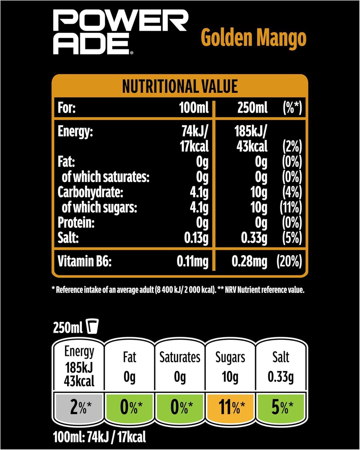 Powerade Golden Mango is a sports drink designed to help athletes and active individuals replenish fluids, electrolytes, and energy during or after intense physical activity. Powerade Golden Mango in a pack of 12 x 500ml bottles is an efficient and tasty way to stay hydrated and energized during workouts or sports. With its balanced mix of electrolytes and carbohydrates, it helps support physical performance and recovery.