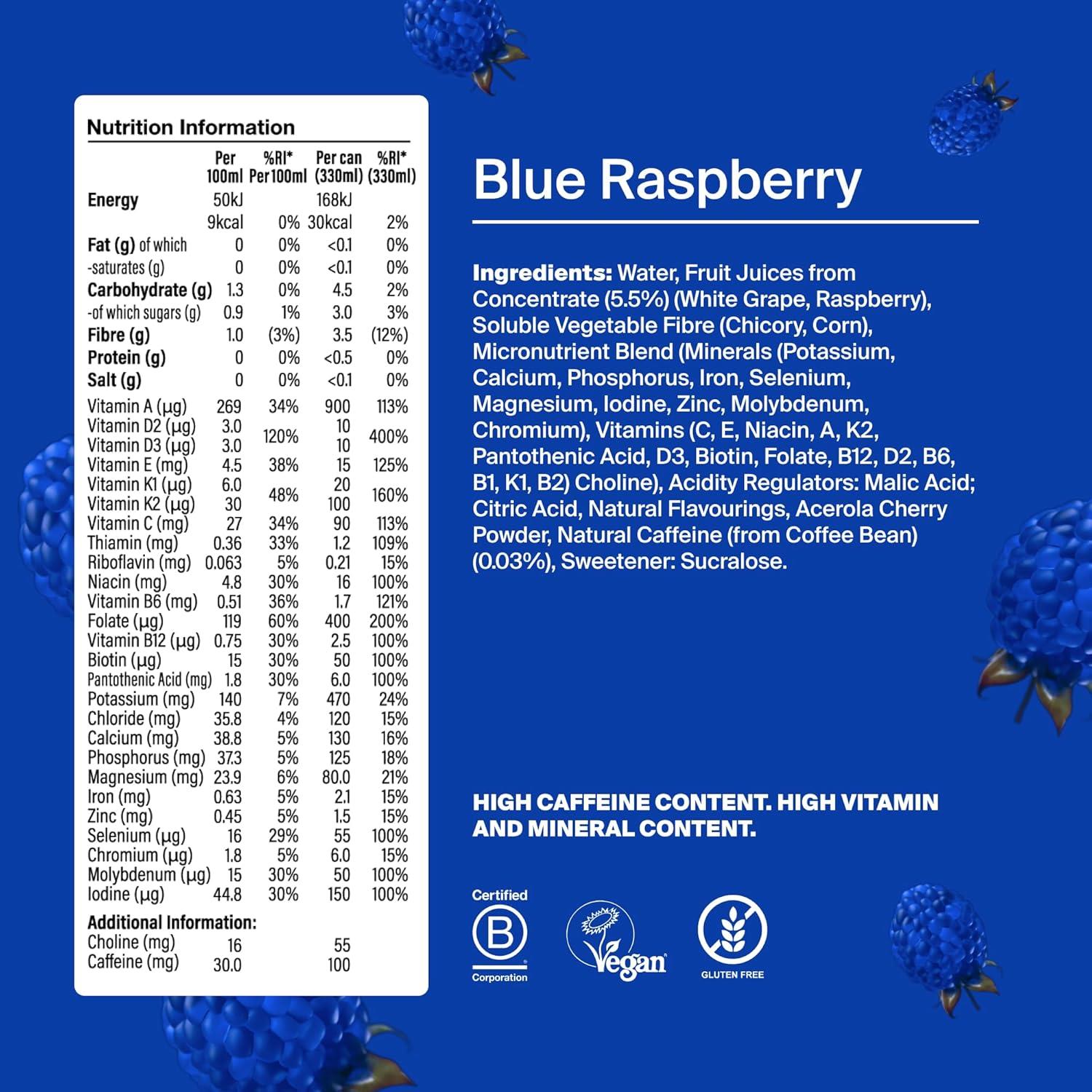 IngredientsWater, Fruit Juices from Concentrate (5.5%) (White Grape, Raspberry), Soluble Vegetable Fibre (Chicory, Corn), Micronutrient Blend (Minerals (Potassium, Calcium, Phosphorus, Iron, Selenium, Magnesium, Iodine, Zinc, Molybdenum, Chromium), Vitamins (C, E, Niacin, A, K2, Pantothenic Acid, D3, Biotin, Folate, B12, D2, B6, B1, K1, B2) Choline), Acidity Regulators: Malic Acid; Citric Acid, Natural Flavourings, Acerola Cherry Powder, Natural Caffeine (from Coffee Bean) (0.03%), Sweetener: Sucralose.